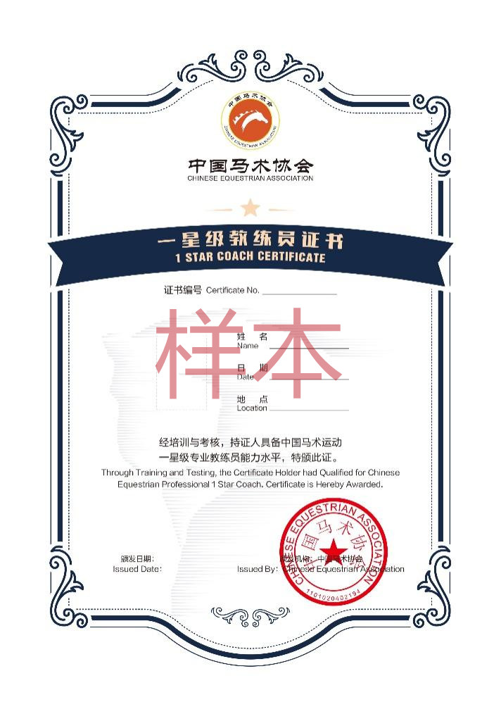 中國馬術(shù)協(xié)會認(rèn)證中國馬術(shù)一星專業(yè)教練證書