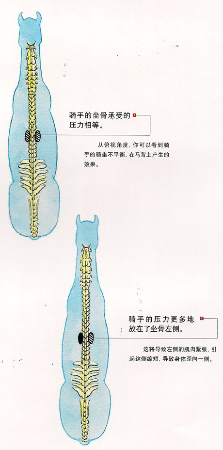 請一個教練牽著你的馬匹,自由韁慢步。感覺馬匹的脊椎在你坐骨下是如何運動的,并且檢查你是否把重量平均地分配在馬匹的脊椎兩側(cè)。如果你習慣了扭曲的騎馬姿勢,當你把姿勢變正直時,你會感到有點不適應(yīng)。知道怎樣是正確的,就要這樣去練習,叫你的朋友把意見反饋給你。