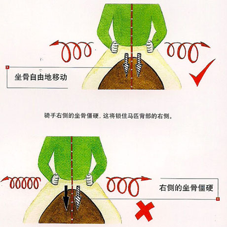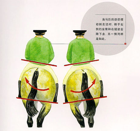 如果你覺得很難體會到側(cè)向的動作,那么就把你的注意力集中到馬匹的肋骨的搖擺上。