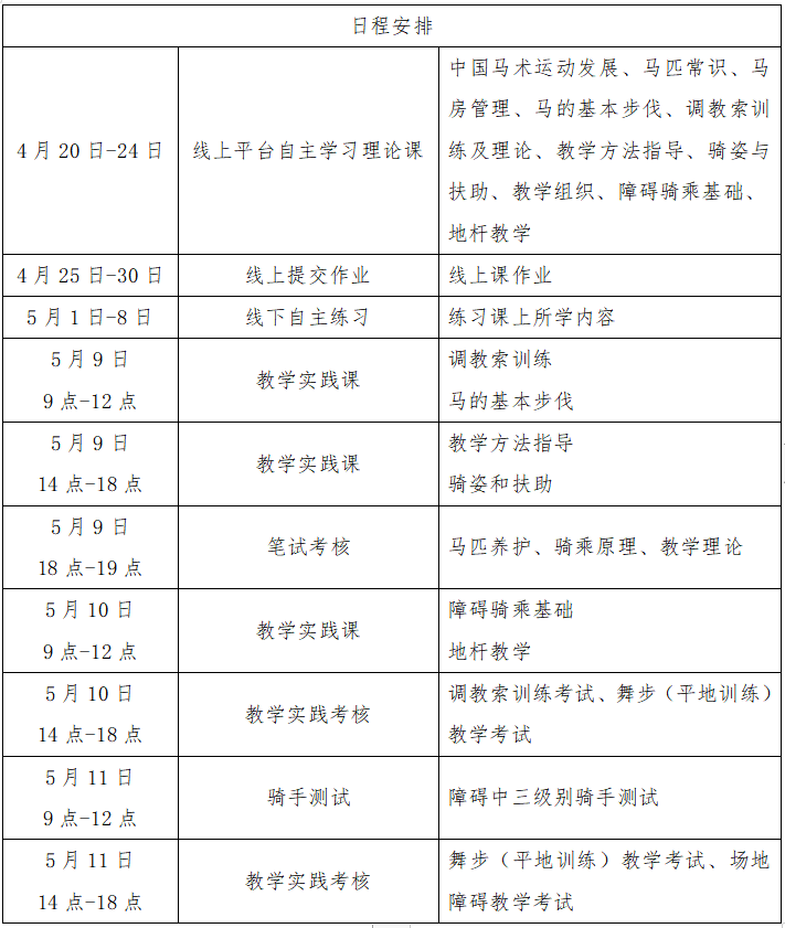 線下輔導(dǎo)和實(shí)踐考核:2022年4月18日-20日,在北京騎緣國(guó)際馬術(shù)俱樂部進(jìn)行線下集中輔導(dǎo)與實(shí)踐考核。