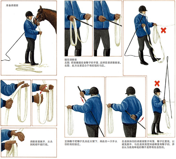 握調(diào)教索有幾種不同的方法。但這里所講的方法不僅簡單有效,而且不論是平地打圈,還是超越障礙時,均能提供更好的控制。所有的方式都需要大量的實(shí)踐,試著把韁繩系在門柱上,反復(fù)練習(xí)。