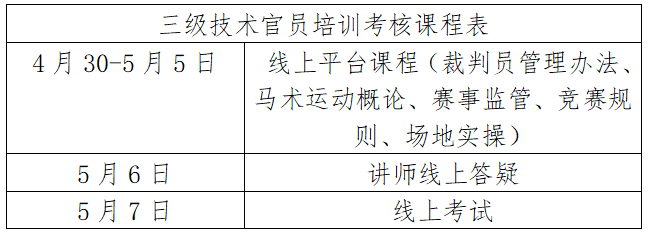 根據(jù)馬術(shù)專業(yè)人才培養(yǎng)計(jì)劃,我協(xié)會(huì)將于2022年4月30日-5月7日在線上舉辦馬術(shù)場(chǎng)地障礙項(xiàng)目三級(jí)技術(shù)官員培訓(xùn)考核活動(dòng),合格者授予中國(guó)馬術(shù)協(xié)會(huì)相應(yīng)等級(jí)技術(shù)官員證。現(xiàn)就本次培訓(xùn)考核相關(guān)事宜通知如下: