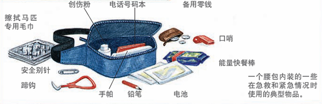 在腰間帶一個腰包很重要,內裝一些急救藥品。肩上挎一個地圖箱裝騎馬路線圖。耐力騎手有一套專門的服裝和鞋類,穿著舒適、耐用,都是用非常輕的材料制成。最流行的是穿一條萊卡彈性纖維褲,這是一種帶有襯墊的緊身褲。戴一頂透氣的頭盔能幫助你在長途騎馬過程中保持涼爽。