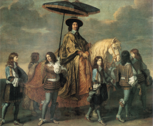 勒布倫的繪畫創(chuàng)作恰到好處地反映出當(dāng)代藝術(shù)的風(fēng)格與品味,略帶華麗感的畫面讓人印象深刻。這幅《大法官塞古埃騎馬像》描繪的是1660年,大法官塞古埃跟隨國王路易十四進入巴黎時,趾高氣揚的景象。塞古埃(1588-1672)是法國政治家、司法官,公爵出身,曾任掌璽大臣、法國首席大法官,他是勒布倫的最主要資助人。塞古埃騎著一匹擁有長長鬃毛與額發(fā)的美麗白馬,在一行人的簇擁下盡顯時尚與華麗。勒布倫把塞古埃的入城儀式畫得極其體面,以表彰大法官的“功勛”。大法官騎在馬上,侍從前呼后擁,法官的坐騎上披著國王賜予的錦緞繡被。繡被很長,得由一個侍從在后面提著才不至拖到地上。有的侍從手執(zhí)華蓋,緊緊尾隨。而這些青年騎士侍從,個個都是血統(tǒng)純正的“佩劍貴族”,法官至高無上的權(quán)勢及地位不言而喻。1942年,這幅畫由大法官的后人獻給了盧浮宮。