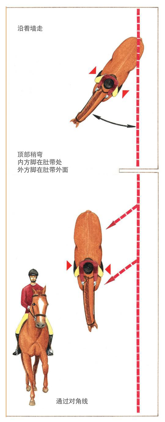 讓馬不偏離對角線的好方法是做幾步橫步,然后伸直,再重復。用這種方法使馬不能通過甩外側肩來逃避工作。如果馬開始甩肩,讓肩頓一下以使后臀跟上,然后再做橫步。