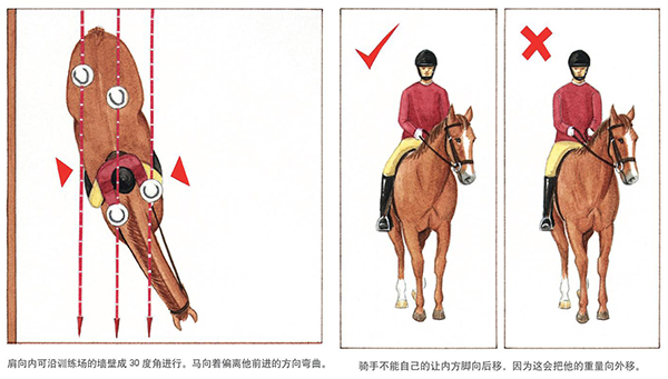肩向內(nèi)沿訓(xùn)練場(chǎng)的邊墻呈30度角進(jìn)行,使馬向著偏離它的移動(dòng)方向彎曲。