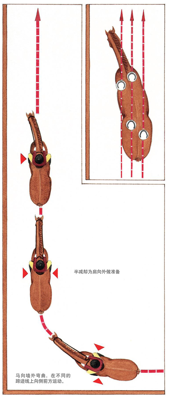 肩向外這個(gè)詞不是很恰當(dāng),因?yàn)樵谒袀?cè)行運(yùn)動(dòng)中,馬要彎曲的那一側(cè)是內(nèi)方。但是,由于肩部移向訓(xùn)練場(chǎng)外側(cè),所以用肩向外來(lái)描述這個(gè)動(dòng)作。