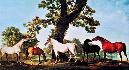 《大橡樹下的母馬和馬駒》是其廣為流傳的代表作之一。在蔥郁唯美的大橡樹前,馬兒們安詳站立,陽光般的暖色調(diào)緩緩灑下,股股溫情四溢流露,好似此時的世界失去了流言喧鬧,一種田園的靜謐安然于此。整幅畫面采用古典平穩(wěn)的橫構(gòu)圖,五匹馬兒交相輝映,有的駐足凝視,有的幸福地吸允著,有的彎下頭,享受著自然的美味,安寧得好似早已張望到世界的盡頭,享盡得好似早已品透一生百味,配上略顯輕快的節(jié)奏,馬兒們好像就這樣訴說著生命的贊歌,展現(xiàn)出一幅古典式詳重寧和之景況。而這些對于它們的老友斯塔布斯來講并不難理解,斯塔布斯從小便與馬兒們結(jié)下深厚的友誼,隨后便朝夕相處。他的父親也經(jīng)營著以馬具為主要商品的皮革店。所以,斯塔布斯與馬兒有著特殊的感識,自然在展現(xiàn)中也就帶著他人不曾體會到的理解感悟。他筆下的馬兒,是純真的,是自由的,是“飛翔”的。比起那些在硝煙滾滾中遺世怒吼的戰(zhàn)馬而言,更多的是反映馬兒生命本質(zhì)的真樸,一種生命靈性的美。畫中的馬兒恬然靜會,人與馬兒心靈的交談悄然隱匿,在安詳靜謐的空間中,兩股溝通交錯滑翔,在馬兒們凝厚的目光中,道出了本屬于自然的一切,它們,像我們一樣,都有著心靈深處本初的“美”,綻放著獨自生命的風(fēng)采。
