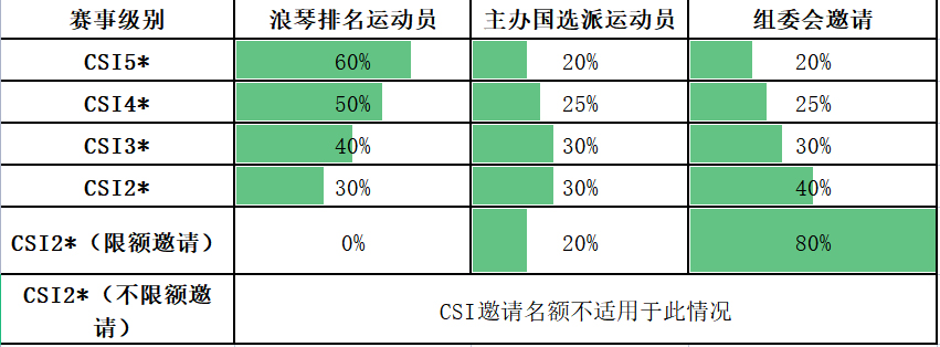 國(guó)際馬聯(lián)場(chǎng)地障礙賽事最低為CSI1*,最高為CSI5*;盛裝舞步賽事最低為CDI1*和CDIO2*,最高為CDI5*和CDIO5*;三項(xiàng)賽賽事最低為CCI2*,最高為CCI5*;耐力賽賽事最低為CEI1*,最高為CEI3*。