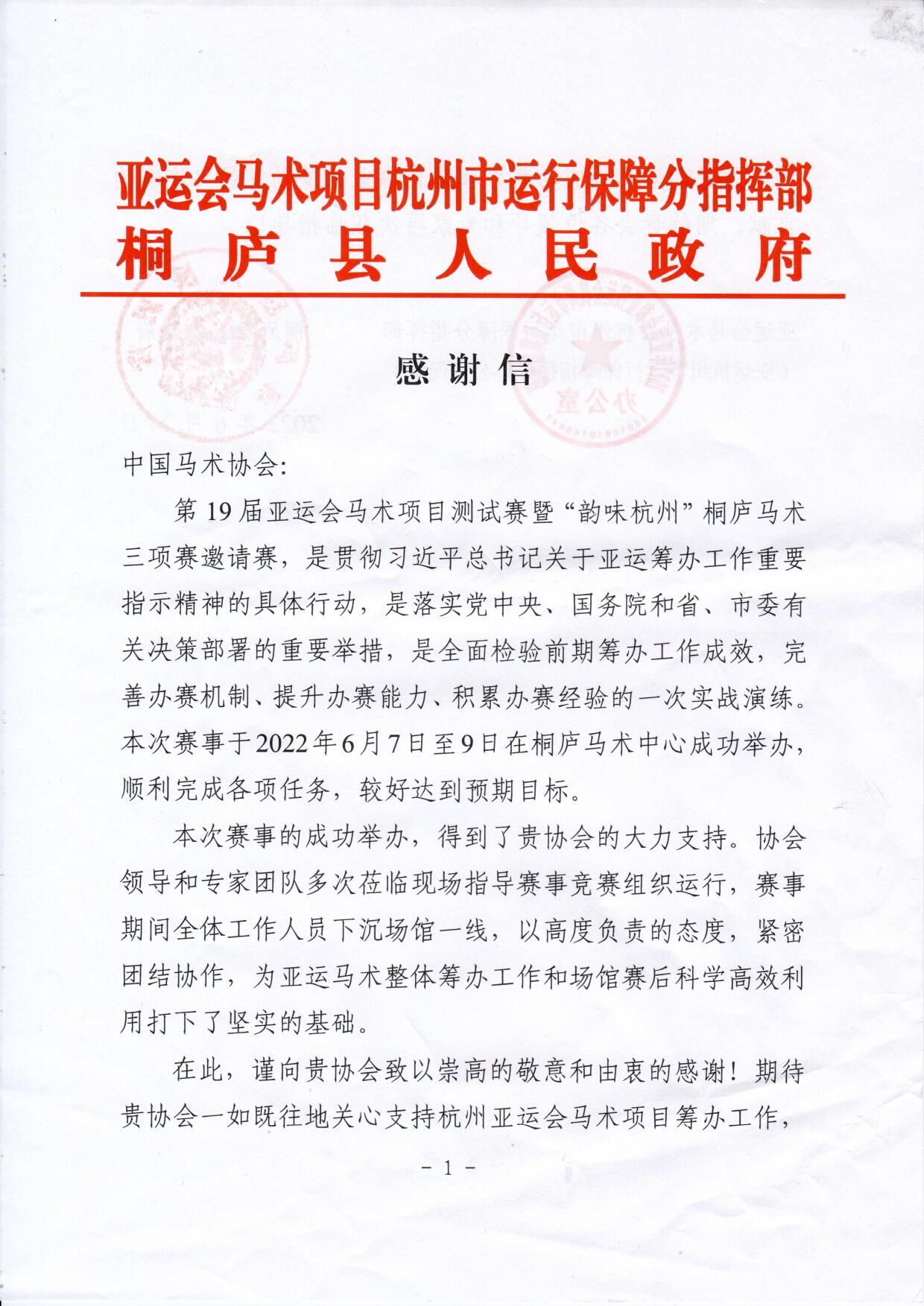亞運會馬術(shù)項目杭州市運行保障分指揮部、桐廬縣人民政府致謝中國馬術(shù)協(xié)會