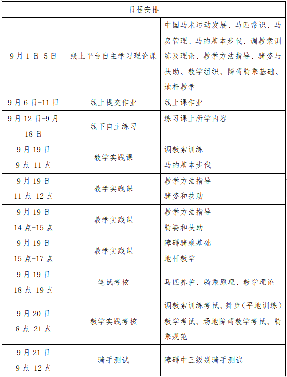 (三)線下輔導(dǎo)和實踐考核:2022年9月19日-21日,在莫奈花園馬術(shù)俱樂部(南京市棲霞區(qū)仙堯路2-12)進行線下集中輔導(dǎo)與實踐考核。