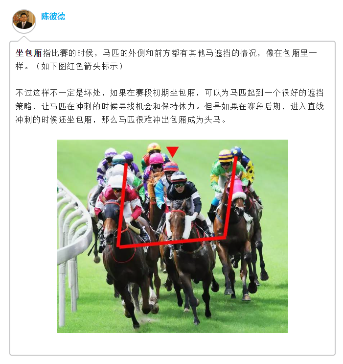 問(wèn):賽馬有很多專業(yè)術(shù)語(yǔ)很有趣,像“坐包廂”就很生動(dòng)地形容了賽馬過(guò)程中的一種狀況,那么“坐包廂”一定對(duì)賽駒不利嗎?