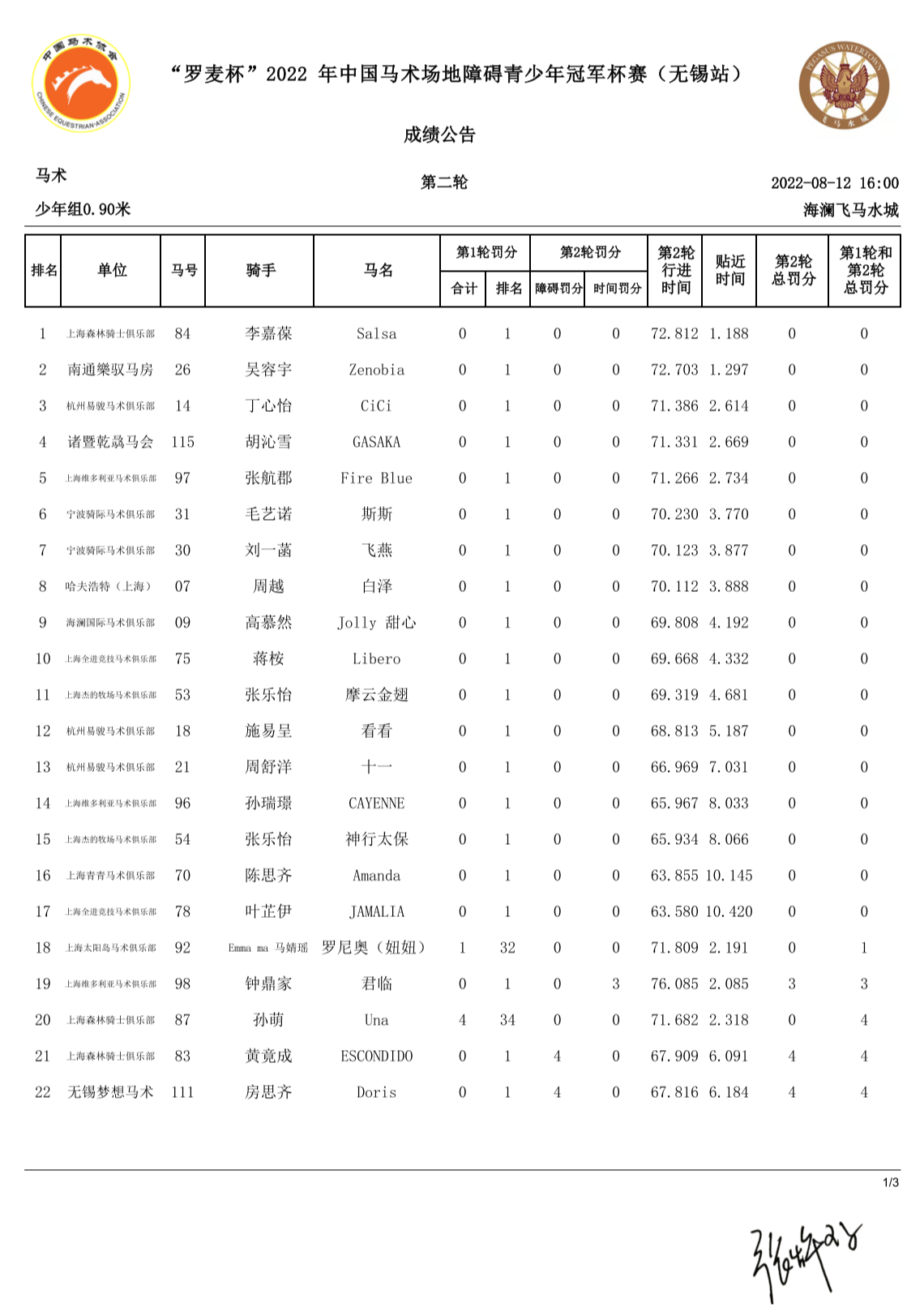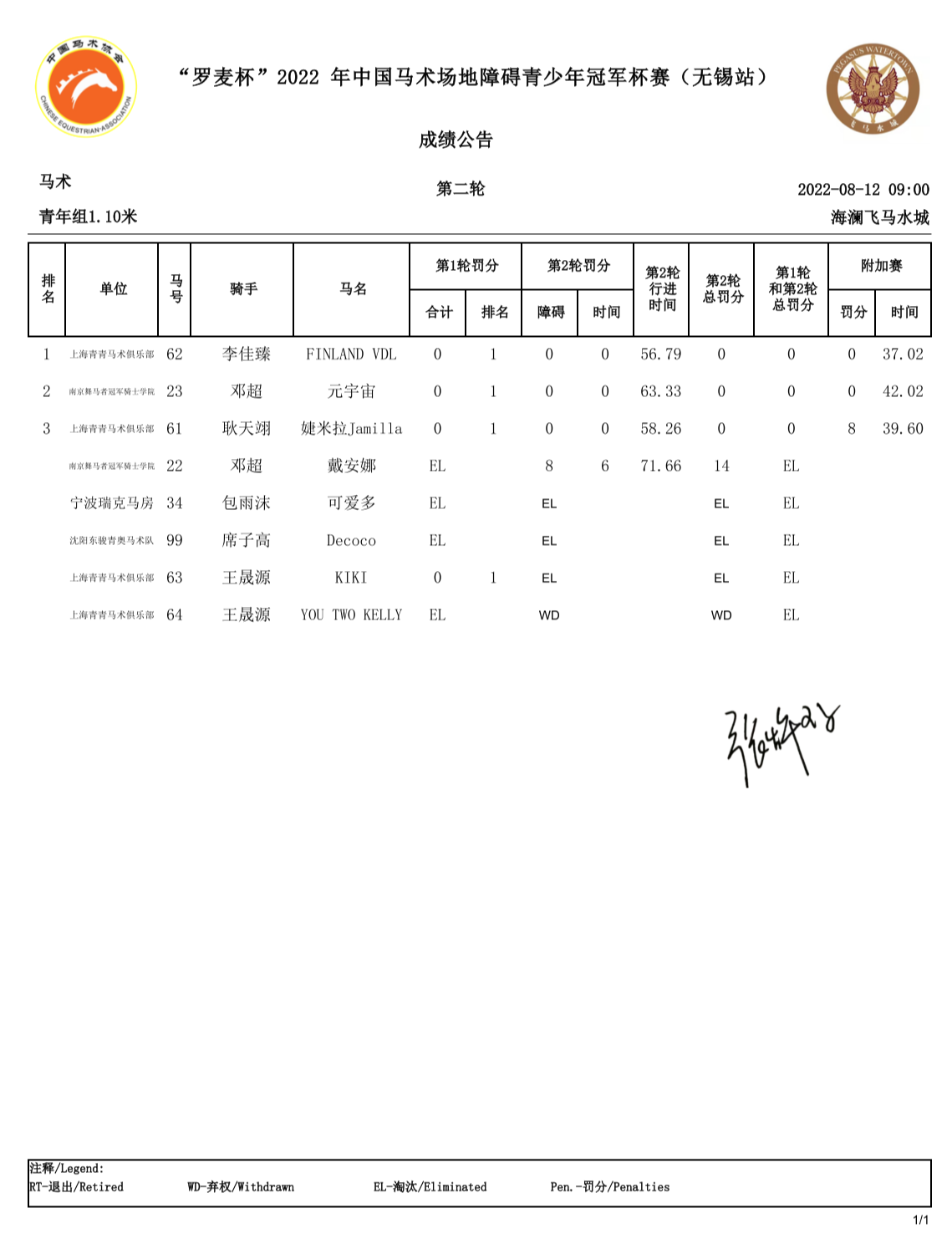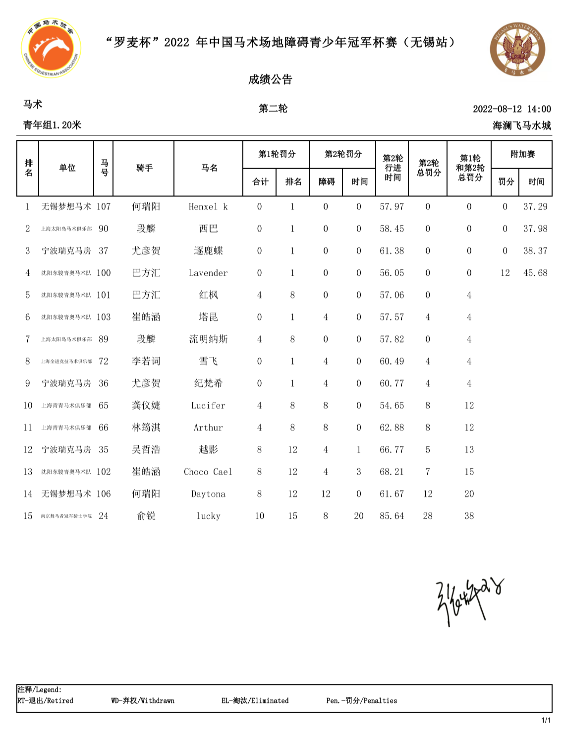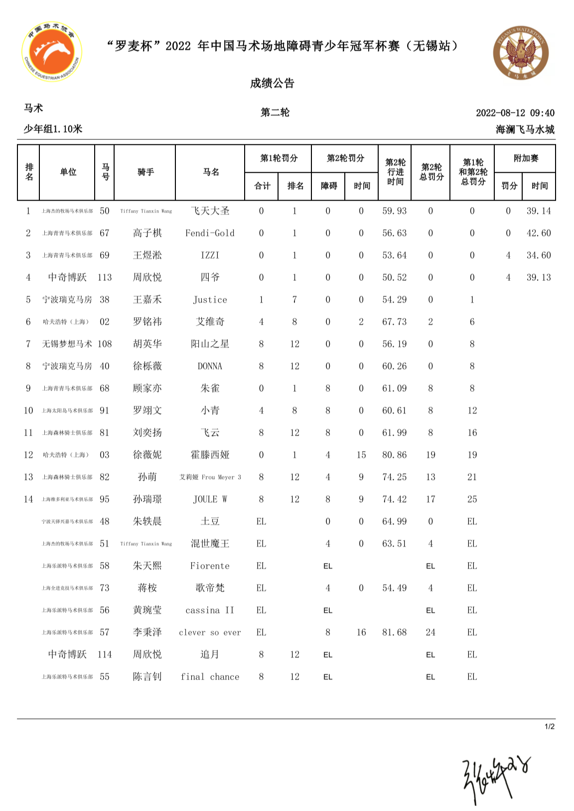 比賽分為青年組1.2米、青年組1.1米,少年組1.1米和少年組0.9米,共計4個級別,總計約120對人馬組合參與了此次比賽。無錫高溫不停,運動員熱情不減。經過兩天的激烈角逐,比賽圓滿結束。各級別主要成績如下: