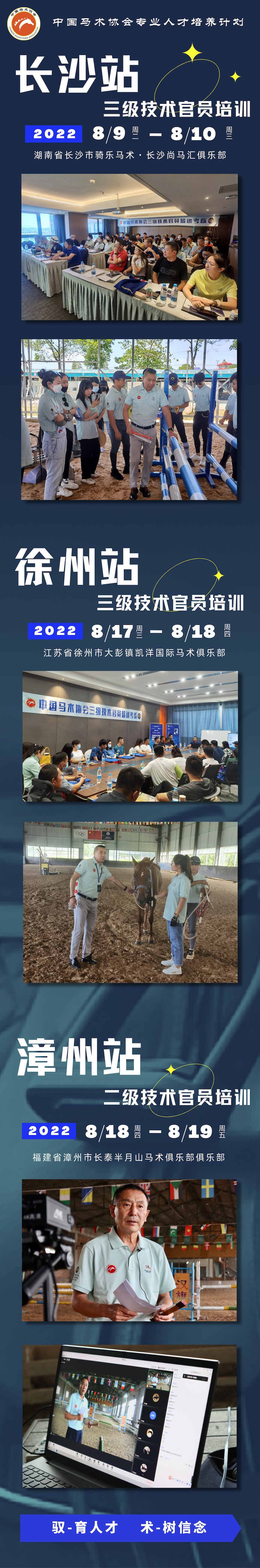 中國馬術(shù)協(xié)會專業(yè)人才培養(yǎng)計劃分別于2022年8月9日-10日、8月17日-18日在長沙和徐州舉辦線下三級技術(shù)官員培訓(xùn)考核,由趙暉老師擔(dān)任兩站培訓(xùn)考核講師。在課堂與實踐中,趙老師通過生動的方式給學(xué)員講授了技術(shù)官員的具體工作內(nèi)容和職責(zé),并通過多年的執(zhí)裁經(jīng)驗,將大量案例分享給學(xué)員。