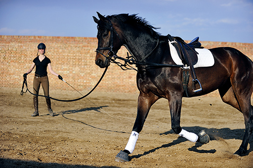 跟騎乘一樣,每5分鐘就應(yīng)該換一次方向。這會(huì)讓馬匹在訓(xùn)練科目中多一些變化,負(fù)載均勻,調(diào)教師還可以通過(guò)調(diào)整側(cè)韁的長(zhǎng)度來(lái)為馬匹提供多種不同步伐的訓(xùn)練方式。