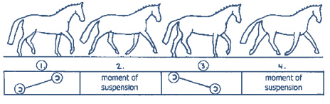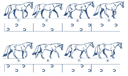 例如:先出右前腿,然后左后腿,再出左前腿,然后右后腿,中間沒有騰空。如果馬體同側(cè)的前后肢同時或幾乎同時跨出,叫對側(cè)步,是錯誤的。