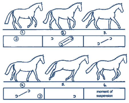 對角線腿同時踏進(jìn),然后騰空。例如:左前肢與右后肢同時落地,騰空,右后肢與左前肢落地。
