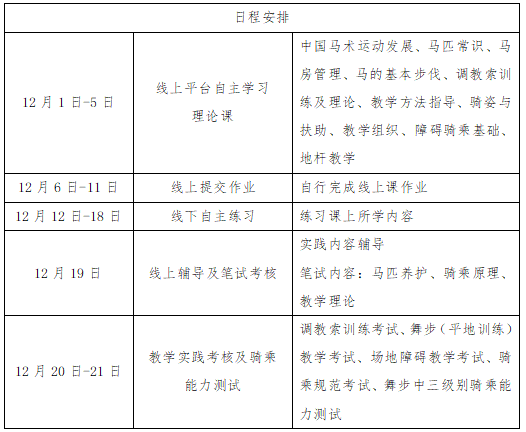 馬術(shù)一星級(jí)專業(yè)教練培訓(xùn)考核將于2022年12月1日-21日在線上開班。本次活動(dòng)以線上方式進(jìn)行培訓(xùn)與考核,中外專家聯(lián)合授課??己撕细裾邔⒈皇谟柚袊?guó)馬術(shù)一星級(jí)專業(yè)教練員能力水平證書,并可進(jìn)一步申報(bào)全國(guó)初級(jí)教練員崗位班,經(jīng)考試合格后獲取初級(jí)職稱。