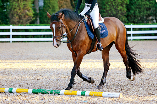 騎手可以在慢步、快步和跑步中走地桿。找到地桿間合適的距離非常重要,教練應(yīng)該幫助騎手,告訴他地桿之間需要保持的合適距離。跑步中走地桿不僅能幫助障礙馬和盛裝舞步馬懂得和感覺到合適的節(jié)奏,也能教他們“坐”,并讓馬匹的后肢承受更大的重量。