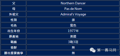 “單式”(Danzig)此名字為波蘭灣岸城市格旦斯克(Gdansk)的德文發(fā)音。其父“北方舞蹈家”為一代名種馬,母系Pas De Nom曾3勝短途賽。