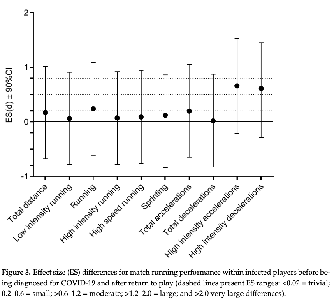 47名克羅地亞足球運(yùn)動(dòng)員,31人感染,感染后1-4周回到比賽,高強(qiáng)度加速和制動(dòng)次數(shù)受影響最大,其次是跑步距離。