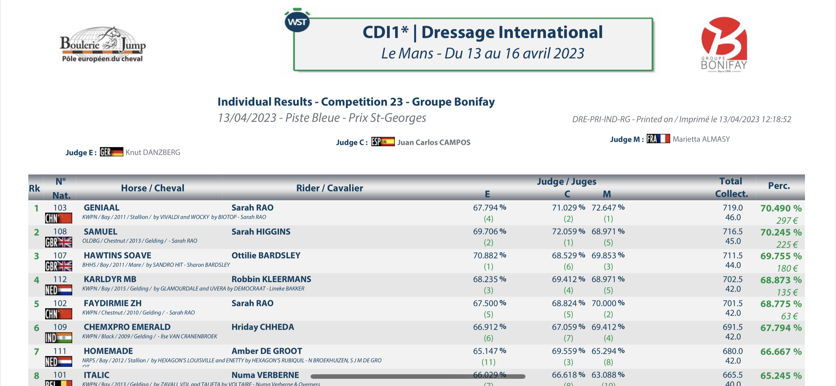 2023年4月13日,中國騎手饒嘉怡搭檔馬匹Geniaal在法國勒芒(Le Mans)舉辦的盛裝舞步CDI1* Prix St-Groges級(jí)別比賽中,以得分70.490%的成績(jī)獲得該場(chǎng)比賽的冠軍。同場(chǎng)比賽中,饒嘉怡還搭檔馬匹Faydirmie ZH以68.775%得分排名第五。這是饒嘉怡今年參加的第二場(chǎng)國際比賽,在3月17日英國阿丁頓(Addington)的第一場(chǎng)比賽中,饒嘉怡與Geniaal搭檔以70.735%得分獲得第五名。兩場(chǎng)比賽的穩(wěn)定發(fā)揮為國家馬術(shù)隊(duì)備戰(zhàn)奧運(yùn)個(gè)人資格奠定了堅(jiān)實(shí)的基礎(chǔ)。
