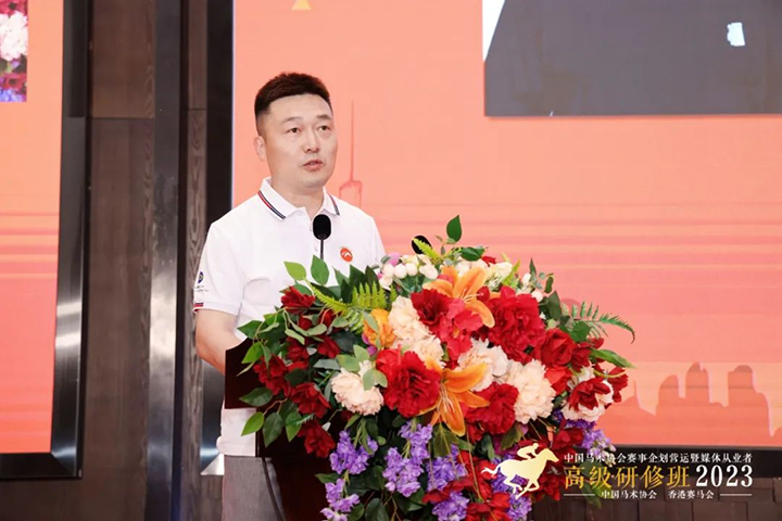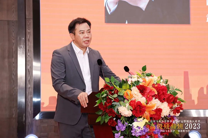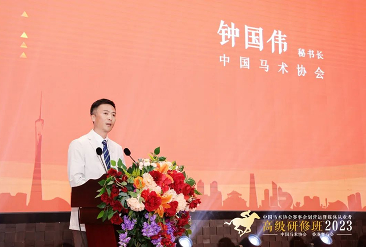 中國(guó)馬術(shù)協(xié)會(huì)秘書(shū)長(zhǎng)鐘國(guó)偉在致辭中表示,中國(guó)馬術(shù)協(xié)會(huì)將習(xí)近平新時(shí)代中國(guó)特色社會(huì)主義思想主題教育和工作實(shí)踐相結(jié)合,致力推動(dòng)行業(yè)高質(zhì)量發(fā)展,以實(shí)際行動(dòng)堅(jiān)定擁護(hù)“兩個(gè)確立”堅(jiān)決做到“兩個(gè)維護(hù)”。我們本著為國(guó)爭(zhēng)光、建設(shè)體育強(qiáng)國(guó)的初心使命,以服務(wù)行業(yè)、助推行業(yè)發(fā)展為目標(biāo),貫徹落實(shí)全國(guó)馬產(chǎn)業(yè)發(fā)展規(guī)劃的要求,動(dòng)員了國(guó)際組織專(zhuān)家學(xué)者等多方力量,主辦了這場(chǎng)面向從業(yè)人士、媒體人員的公益性的培訓(xùn)活動(dòng),旨在夯實(shí)國(guó)內(nèi)馬產(chǎn)業(yè)人才隊(duì)伍建設(shè)根基,吸納多領(lǐng)域的優(yōu)秀人才,共同助推中國(guó)內(nèi)地速度賽馬及馬術(shù)運(yùn)動(dòng)產(chǎn)業(yè)的高質(zhì)量發(fā)展。新一屆中國(guó)馬術(shù)協(xié)會(huì)在國(guó)家體育總局的正確指導(dǎo)下,全國(guó)馬術(shù)同仁的支持下,張小寧主席帶領(lǐng)下,五大體系建設(shè)齊頭并進(jìn),在奧運(yùn)競(jìng)技、群眾體育、青少年體育等方面取得進(jìn)展。15天前,中國(guó)馬術(shù)三項(xiàng)賽隊(duì)在愛(ài)爾蘭虎口拔牙,力克曾獲世錦賽第四名的強(qiáng)勁對(duì)手日本隊(duì),再度斬獲巴黎奧運(yùn)團(tuán)體及個(gè)人參賽資格,新的奧運(yùn)備戰(zhàn)周期開(kāi)啟,催生中國(guó)馬術(shù)發(fā)展新動(dòng)能,在這樣的背景下,中國(guó)馬術(shù)協(xié)會(huì)與香港賽馬會(huì)開(kāi)展了新一輪的全面推進(jìn)國(guó)家賽馬馬術(shù)產(chǎn)業(yè)的戰(zhàn)略合作。我們?cè)谙愀圪愸R會(huì)的大力支持下,以研修班為平臺(tái),集聚馬術(shù)智慧、媒體力量,打造鏈接推動(dòng)全國(guó)馬產(chǎn)業(yè)快速、高質(zhì)量發(fā)展的新格局。