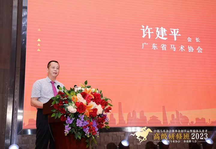 廣東省馬術(shù)協(xié)會(huì)會(huì)長(zhǎng)許建平在隨后的致辭中表示,中國(guó)馬術(shù)隊(duì)接連在東京奧運(yùn)會(huì)等重要賽事中取得了歷史性突破,激勵(lì)了更多的人群參與到馬術(shù)運(yùn)動(dòng)中,馬術(shù)運(yùn)動(dòng)就如春天一般,處處充滿生機(jī),其中廣東省現(xiàn)就有近50家馬術(shù)俱樂(lè)部,參與馬術(shù)活動(dòng)的人群約近50萬(wàn)人,全年開(kāi)設(shè)了近20站的比賽,并首次列入了去年舉辦的省運(yùn)會(huì),有效地推動(dòng)了省馬術(shù)運(yùn)動(dòng)和馬文化馬產(chǎn)業(yè)的深入開(kāi)展。由中國(guó)馬術(shù)協(xié)會(huì)主辦的這次研修班正式開(kāi)班,通過(guò)權(quán)威、專(zhuān)業(yè)的宣講學(xué)習(xí),能進(jìn)一步弘揚(yáng)馬術(shù)運(yùn)動(dòng)的正能量,進(jìn)一步規(guī)范馬術(shù)運(yùn)動(dòng)健康發(fā)展,能更好地促進(jìn)對(duì)馬術(shù)運(yùn)動(dòng)的報(bào)道宣傳,讓更多的人了解和參與馬術(shù)運(yùn)動(dòng),也將更好地配合《粵港澳大灣區(qū)發(fā)展規(guī)劃綱要》指出的推進(jìn)粵港澳大灣區(qū)地區(qū)馬匹運(yùn)動(dòng)及相關(guān)產(chǎn)業(yè)發(fā)展的要求。