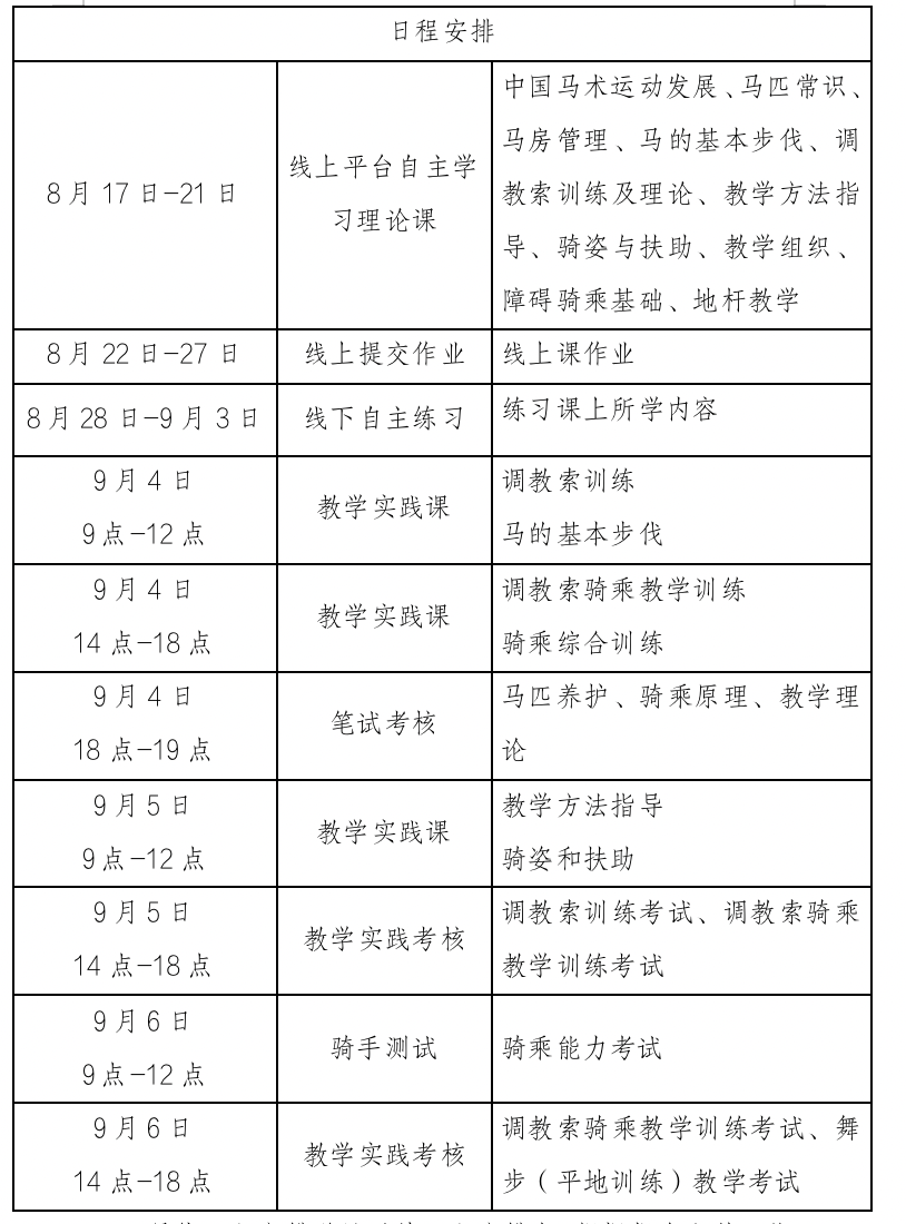 (三)線下輔導(dǎo)和實(shí)踐考核:2023年9月4日-6日,在安徽震龍馬術(shù)俱樂部進(jìn)行線下集中輔導(dǎo)與實(shí)踐考核。
