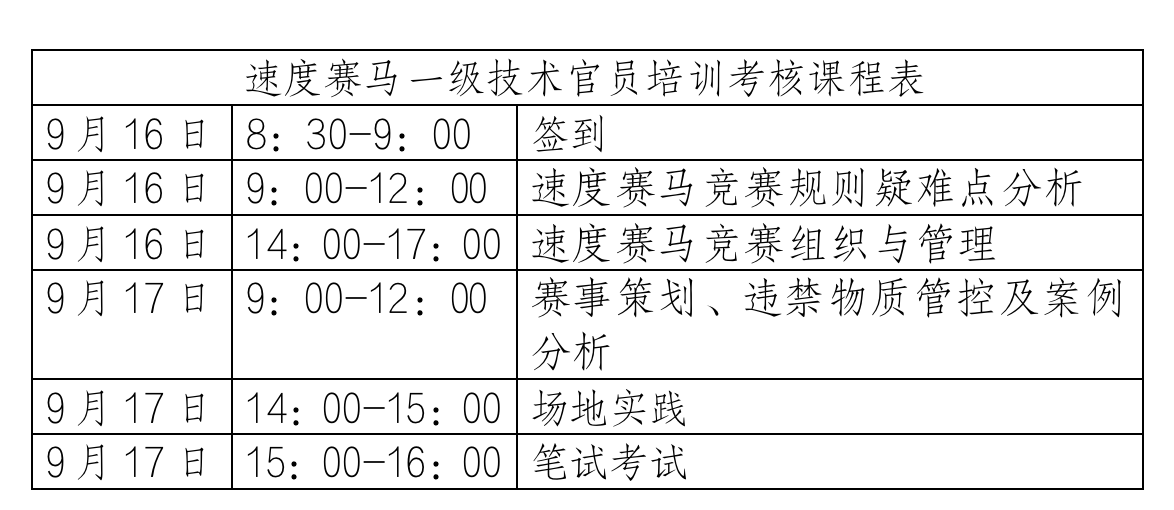 根據(jù)馬術(shù)專業(yè)人才培養(yǎng)計(jì)劃,我協(xié)會(huì)將于2023年9月16日-17日在武漢東方馬城國際賽馬場舉辦速度賽馬一級(jí)技術(shù)官員培訓(xùn)考核活動(dòng),合格者授予中國馬術(shù)協(xié)會(huì)相應(yīng)等級(jí)技術(shù)官員證?,F(xiàn)就本次培訓(xùn)考核相關(guān)事宜通知如下: