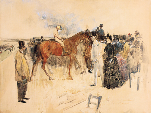 這幅《多維爾賽馬》以法國著名的賽馬場為創(chuàng)作背景,透過熙熙攘攘的人群,我們會不由得聯(lián)想到法國興盛的馬業(yè),觀看賽馬甚至成為法國上流社會的達(dá)官顯貴互通有無的一個重要契機(jī)。畫中還為我們呈現(xiàn)了容色妍麗的女士們,身著為賽事精心定制的禮帽及時裝同男賓一同出席賽馬活動,這種引領(lǐng)法國時尚潮流的穿戴恰恰證明了法國人與生俱來的浪漫情致和對賽馬文化的熱愛。(馬術(shù)雜志)