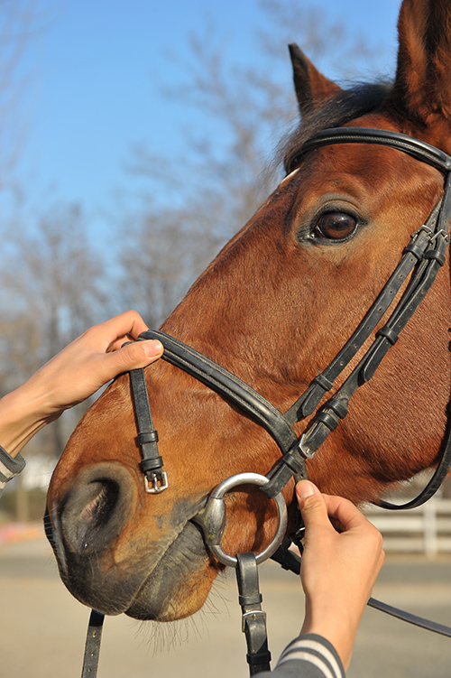 倘若在馬匹下頜和上鼻革之間可以放入2個手指,這說明水勒已經(jīng)基本調(diào)整合適了。此外,衡量水勒的舒適度還有一個方法,就是看下鼻革:如果它勒得馬嘴起了褶皺,那就應該將它調(diào)松點兒,不然馬嘴會被勒疼的。