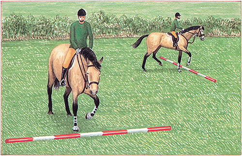 在開始跳障礙之前,先放置地桿練習(xí)。起初只放置一根地桿,然后在行進(jìn)的直線甚至是弧線路徑上再設(shè)其他地桿,騎手依次以快步和跑步通過(guò)每組地桿練習(xí)。當(dāng)馬開始習(xí)慣后,還要讓它學(xué)會(huì)放松地、節(jié)奏感十足地以快步或跑步完成這項(xiàng)練習(xí)。騎手要在這個(gè)過(guò)程中學(xué)會(huì)判斷障礙間的距離。當(dāng)我們?cè)O(shè)置多個(gè)地桿的時(shí)候,每道地桿之間的距離應(yīng)在2.2-2.4米之間。在這個(gè)距離范圍內(nèi),馬可以做2個(gè)快步或者1個(gè)跑步。騎手可以練習(xí)快步、跑步,包括空中換腿。