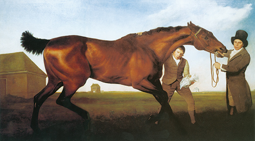 這是18世紀(jì)英國著名的馬畫家喬治·斯塔布斯76歲時創(chuàng)作的作品。畫中描繪的是當(dāng)時最強(qiáng)的賽馬之一哈姆特尼安在1799年3月25日的一場激烈的比賽奪標(biāo)勝利后的場面。畫家用敏銳的觀察出色地描繪了這匹賽馬在完成殘酷的比賽后興奮未消的形狀:鼻孔張大,耳朵后抿,抬起的后蹄刨向地面,還有那肋處馬刺和鞭的痕跡。在畫面背景藍(lán)天白云下有三個建筑,由左向右依次為按摩房、國王的觀賞席和公爵的觀賞席。這是當(dāng)時英國賽馬之城紐瑪克特西斯賽馬場的場景。由此可以想象賽馬在18世紀(jì)的英國的確是王室的最愛,這樣的傳統(tǒng)一直延續(xù)到今天。