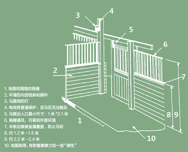 馬廄是馬房或庇護處的基本功能單元。在進行馬廄設計時,工作人員和馬匹的安全是應主要考慮的因素。日常工作的便利與好的馬匹護理息息相關。不管是什么樣的管理風格或需求,安全的馬廄都具備同樣的基本元素。馬廄特點有很多選擇,不同的選擇關系到功能和費用支出。