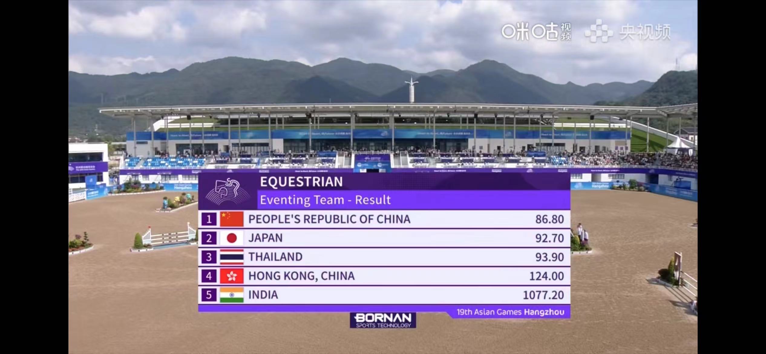 共有來自中國、日本、印度、泰國、中國香港等5支隊伍、21對組合,參與亞運會三項賽團(tuán)體及個人名次的角逐。經(jīng)歷越野賽的長途奔襲后,多個組合出現(xiàn)了驗馬不通過、成績無效的情況。中國隊梁銳基和KARIAANTJE 組合因二次驗馬不通過無緣個人名次爭奪。印度隊因場地障礙賽參賽人數(shù)不足三人而無緣團(tuán)體名次。中國香港隊場地障礙賽發(fā)揮不利,未能站上領(lǐng)獎臺。中國馬術(shù)隊則克服困難,延續(xù)了前兩日舞步折桂、越野爭先的領(lǐng)先優(yōu)勢,在場地障礙賽中再現(xiàn)實力,摘得三項賽團(tuán)體及個人兩項金牌!
