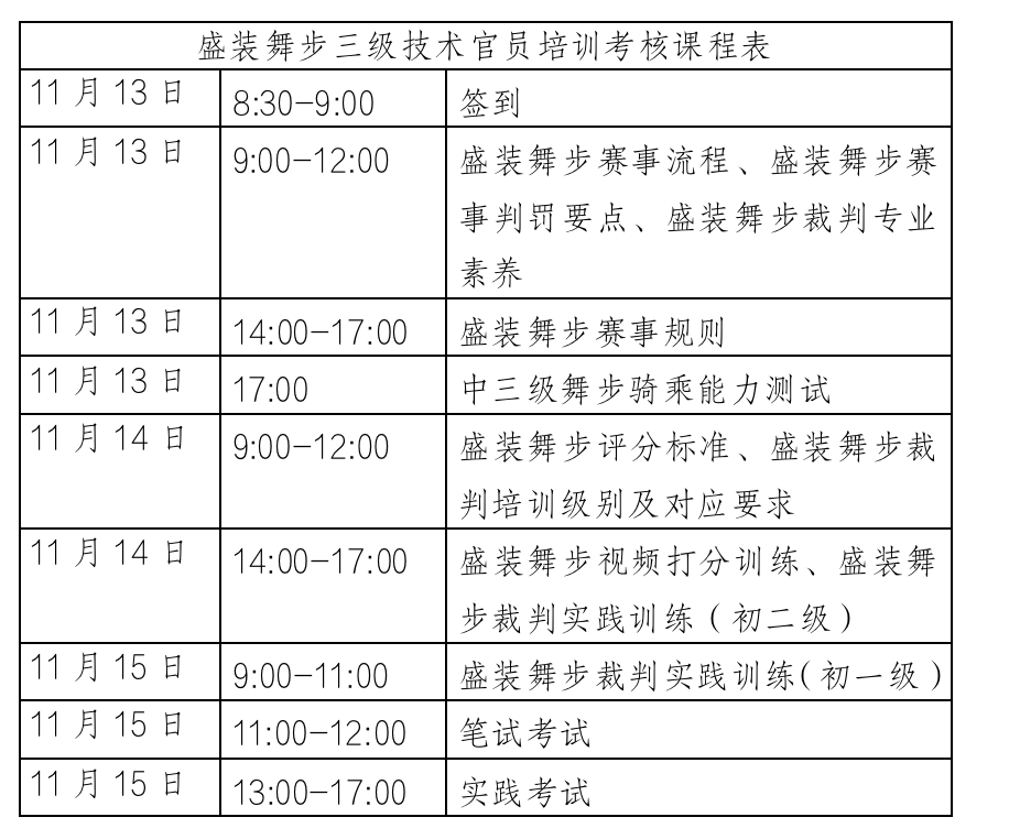 盛裝舞步三級技術(shù)官員培訓(xùn)考核課程表