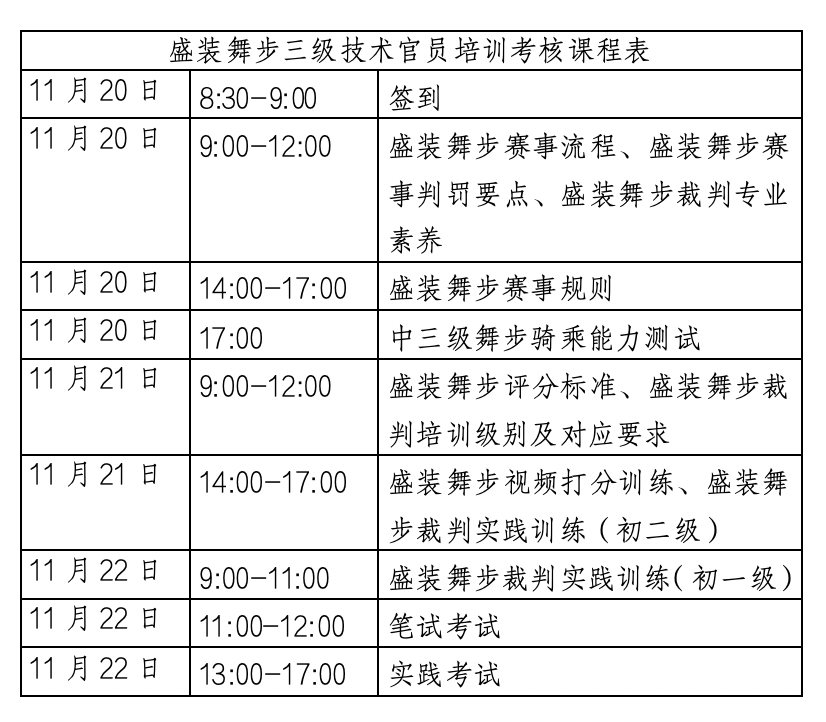 2. 盛裝舞步三級技術(shù)官員培訓考核收取報名費:1650元,如有學員因盛裝舞步中三級測試未通過無法參加后續(xù)實踐考核將退還考核費800元,租馬費不退。