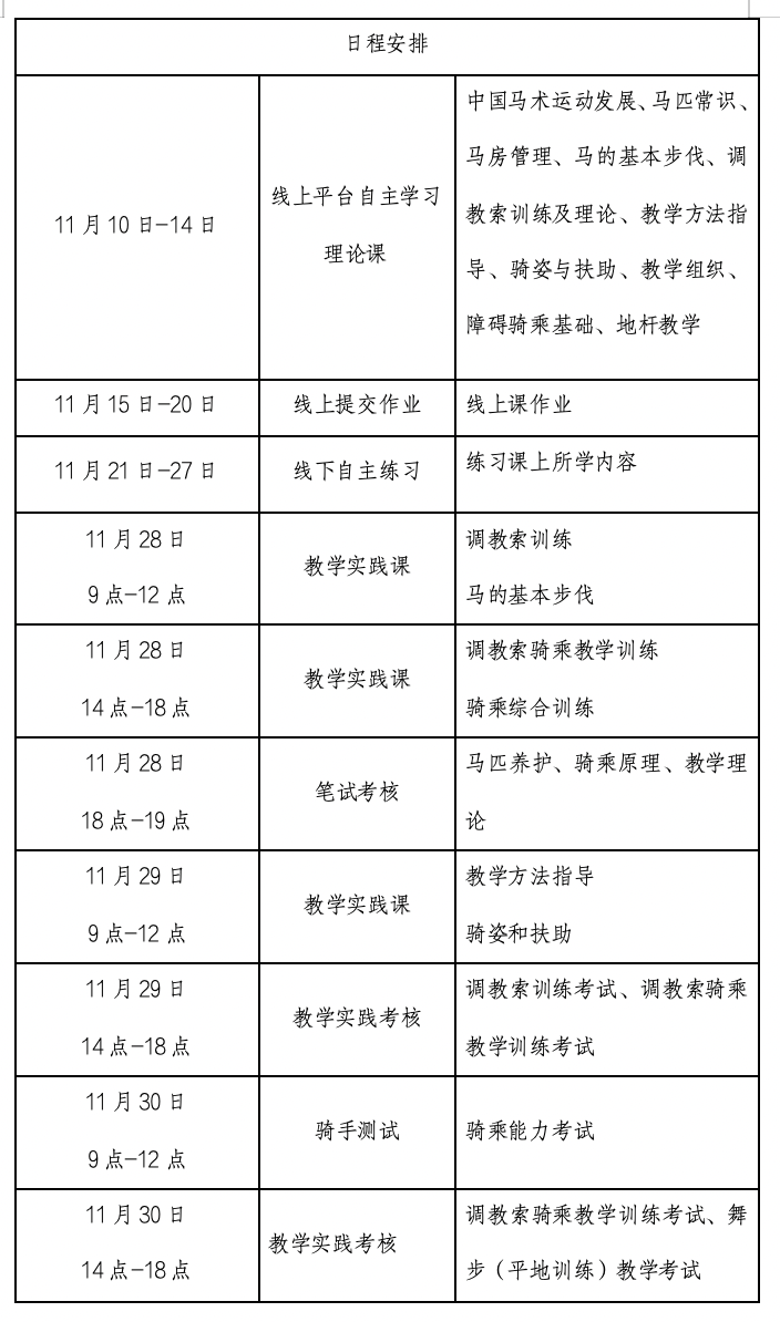(三)線下輔導(dǎo)和實踐考核:2023年11月28日-30日,在寧波騎際馬術(shù)俱樂部進(jìn)行線下集中輔導(dǎo)與實踐考核。