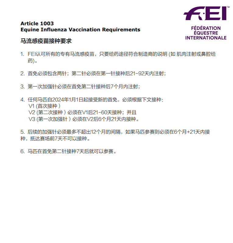 各參賽運動隊于2024年1月25日報到,報道的同時提交馬匹護照和馬匹檢疫證明,未提交相關(guān)證明的馬匹不得進入馬廄。參賽馬匹均須按國際馬聯(lián)相關(guān)規(guī)定注射流感疫苗,并在護照進行詳細記錄,無疫苗或疫苗不符合國際馬聯(lián)要求的馬匹,組委會有權(quán)拒絕其參賽。