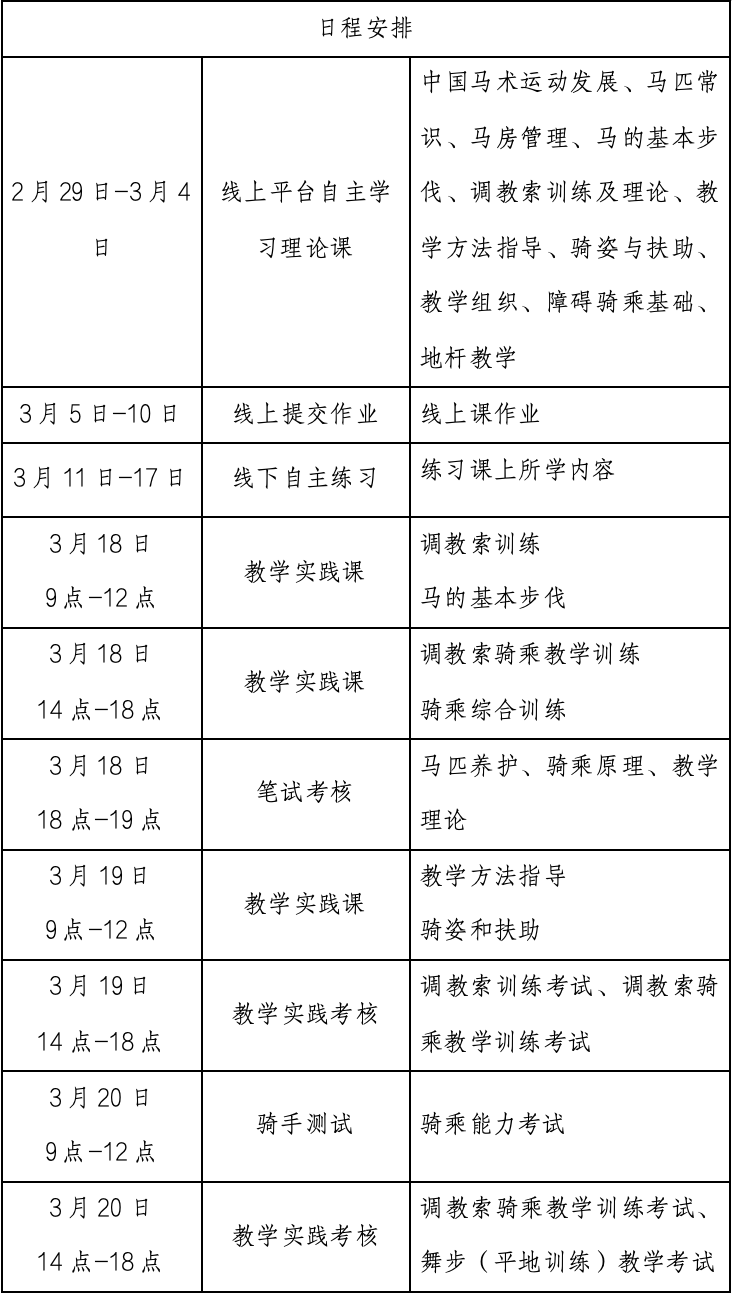 (三)線下輔導和實踐考核:2024年3月18日-20日,在秦漢新城國際馬術中心進行線下集中輔導與實踐考核。