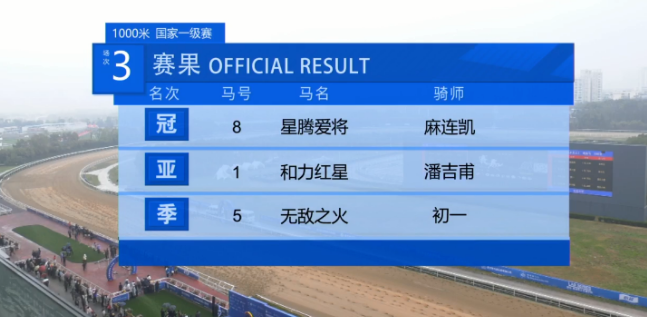 第三場“江城杯”4歲及以上1000米賽事,匯集成年馬短途好手,最終來自星騰馬業(yè)名下“星騰愛將”贏下此戰(zhàn)。