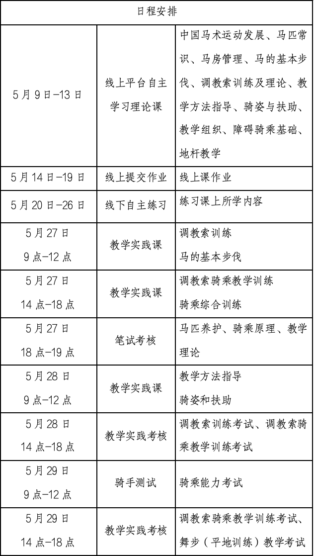 (三)線下輔導(dǎo)和實(shí)踐考核:2024年5月27日-29日,在上海東郊青青馬術(shù)俱樂部進(jìn)行線下集中輔導(dǎo)與實(shí)踐考核。