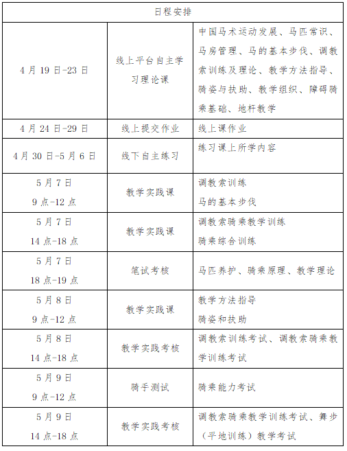 (三)線下輔導(dǎo)和實踐考核:2024年5月7日-9日,在青島博洋馬術(shù)俱樂部進行線下集中輔導(dǎo)與實踐考核。