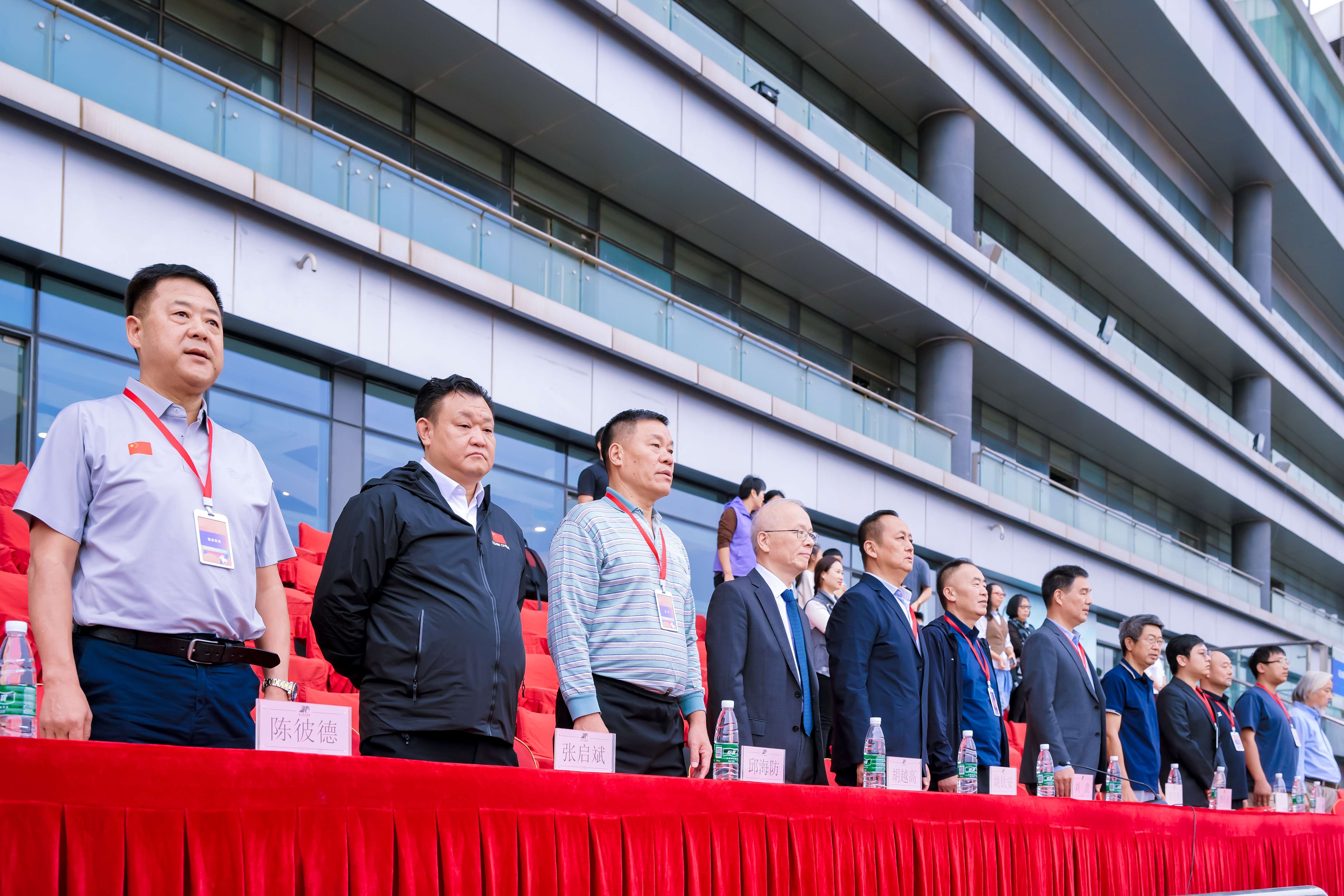 開幕式上,在領導、嘉賓、馬主、觀眾和騎師的共同見證下,陳九慶副秘書長宣布本站公開賽正式開賽。隨后,主持人邀請蒞臨本次賽事的主要領導及嘉賓與參賽騎師合影,并向現(xiàn)場觀眾介紹各位騎師。
