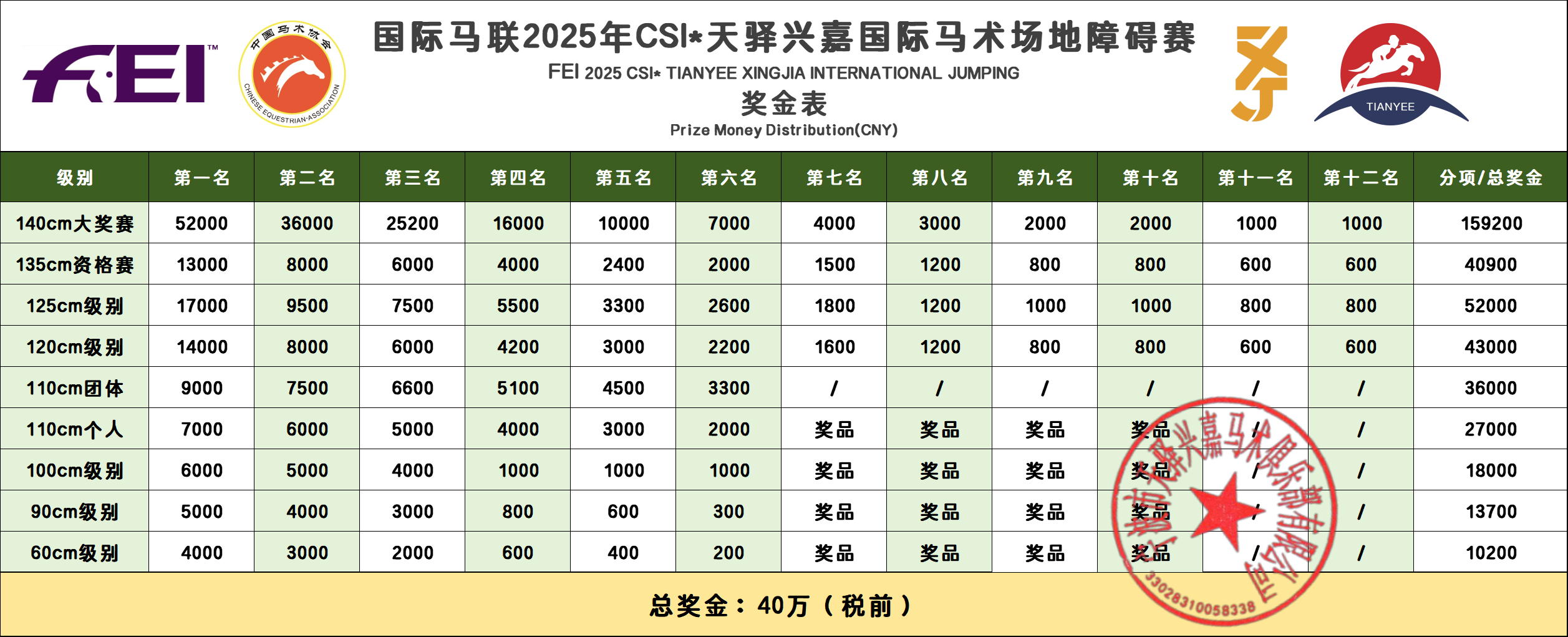 國際馬聯(lián)2025年CSI*天驛興嘉國際馬術(shù)場地障礙賽將于2025年3月14日(周五)至3月16日(周日)在浙江省寧波市天驛興嘉馬術(shù)俱樂部舉辦。為使比賽順利進(jìn)行,現(xiàn)將賽事有關(guān)事宜通知如下:
