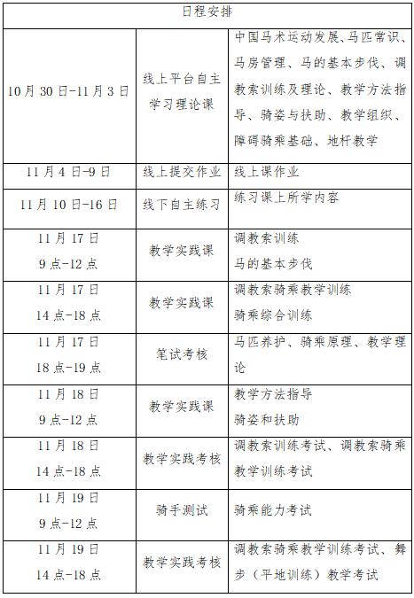 (三)線下輔導(dǎo)和實踐考核:2025年11月17日-19日,在湖南超級馬力馬術(shù)俱樂部進(jìn)行線下集中輔導(dǎo)與實踐考核。