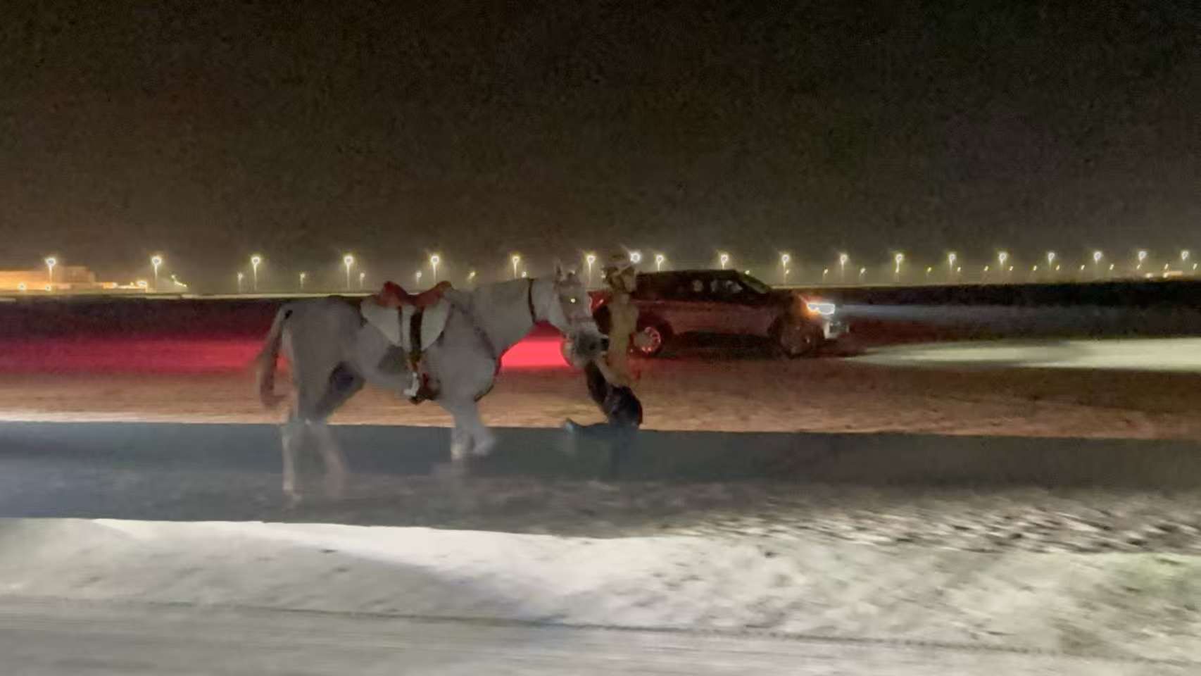 本次比賽全程119公里,當?shù)貢r間16:00起跑,次日凌晨3時29分結(jié)束。賽道漫長,夜色與風沙交織,氣候與環(huán)境的變化給人馬帶來極大挑戰(zhàn)。