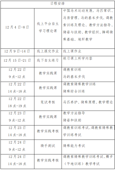 (三)線下輔導(dǎo)和實(shí)踐:2025年12月22日-24日,在??谛◎T士馬術(shù)俱樂(lè)部進(jìn)行線下集中輔導(dǎo)與實(shí)踐。