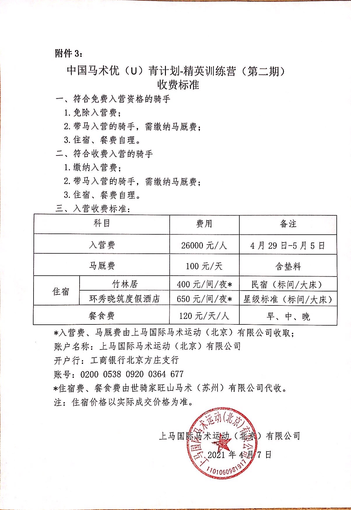 依據(jù)參加中國(guó)馬術(shù)優(yōu)青計(jì)劃-精英直播賽第一站(2020年5月23-24日)及第二站(2020年7月24-25日)比賽中獲得第一期中國(guó)馬術(shù)優(yōu)青計(jì)劃-精英訓(xùn)練營(yíng)資格,但并未參加訓(xùn)練的騎手,可免費(fèi)參加本期訓(xùn)練營(yíng)。